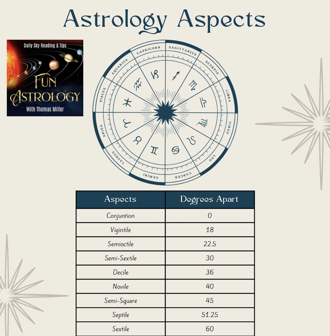 A handy download with all the major and minor astrology aspects in one place. Perfect to have by your charting software, or on your monitor for easy reference.